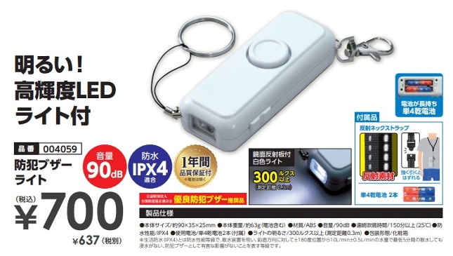 ※生活防水(IPX4)とは防水性能等級で、散水装置を用い、鉛直方向に対して±180度位置から10L/min±0.5L/minの水量で最低5分間の散水しても 浸水がない、防犯ブザーとして有害な影響がないことを表す等級です。